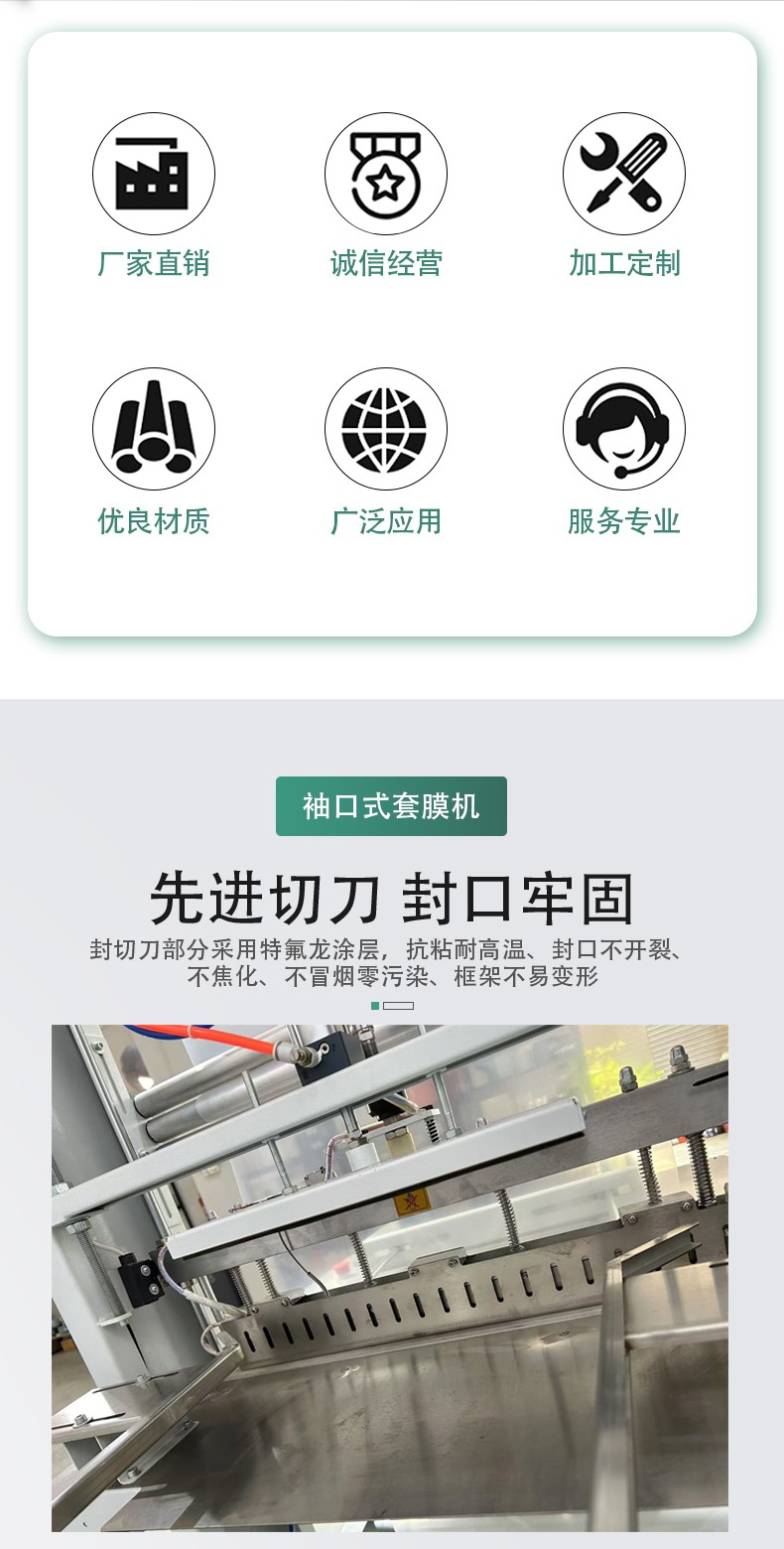 产品经输送带进入设备后,薄膜被自动套在产品外部,通过电热丝高温封切形成袖口状包装,随后进入热收缩通道,利用高温使薄膜均匀收缩,紧贴产品表面,完成 “套膜 - 封切 - 热收缩” 三步包装流程。