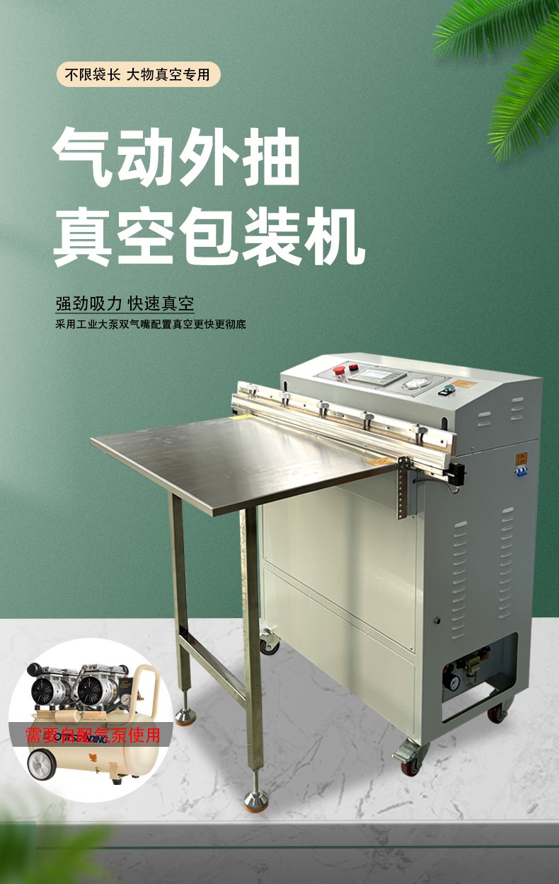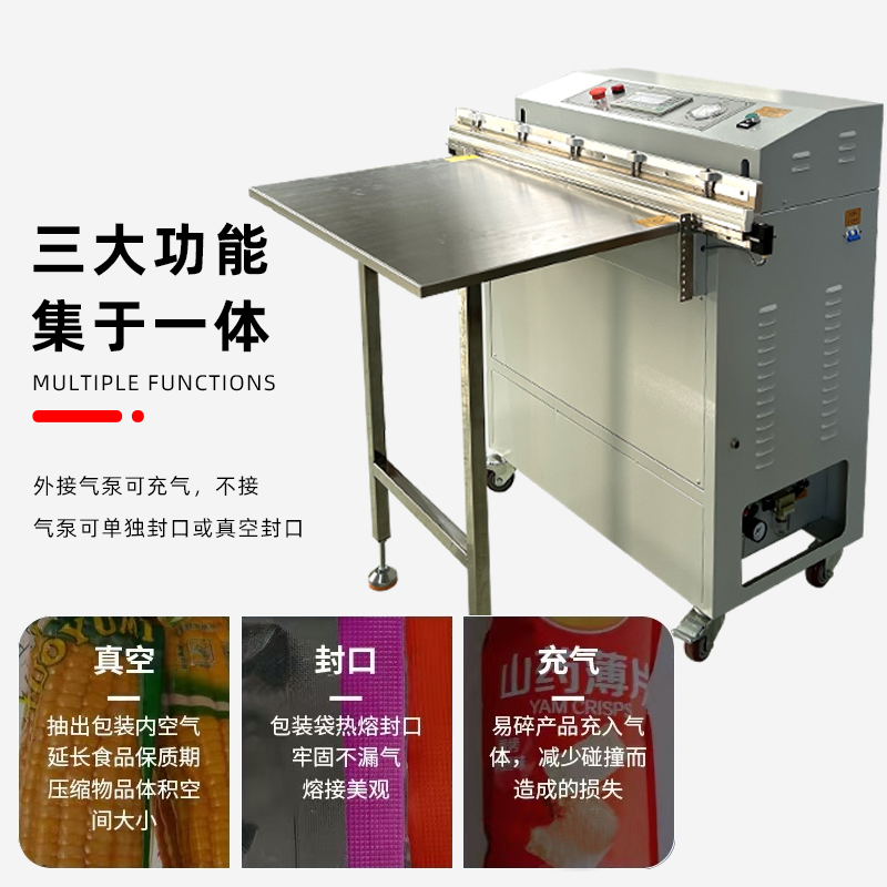 工作原理:将物品放入包装袋后,把袋口置于包装机的抽气口附近。启动机器,气动系统控制抽气阀门打开,真空泵通过抽气管道抽取包装袋内的空气,真空表实时显示真空度,达到预设真空度后,抽气阀门关闭,气动系统驱动热封装置,热封条压住袋口并加热使塑料材料熔化黏合,冷却后完成包装。
