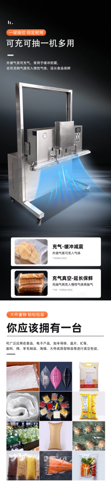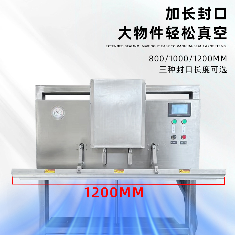 可定制与多模式适配不同尺寸:部分机型支持封口规格定制,封口长度可达到 800mm、1000mm 甚至 1200mm 等,适配不同宽度的包装袋。同时,部分先进机型预设多组工作模式,可快速切换真空、充气、封口等流程,适配从小袋糕点到大袋五金模具等不同尺寸、类型产品的包装需求。
