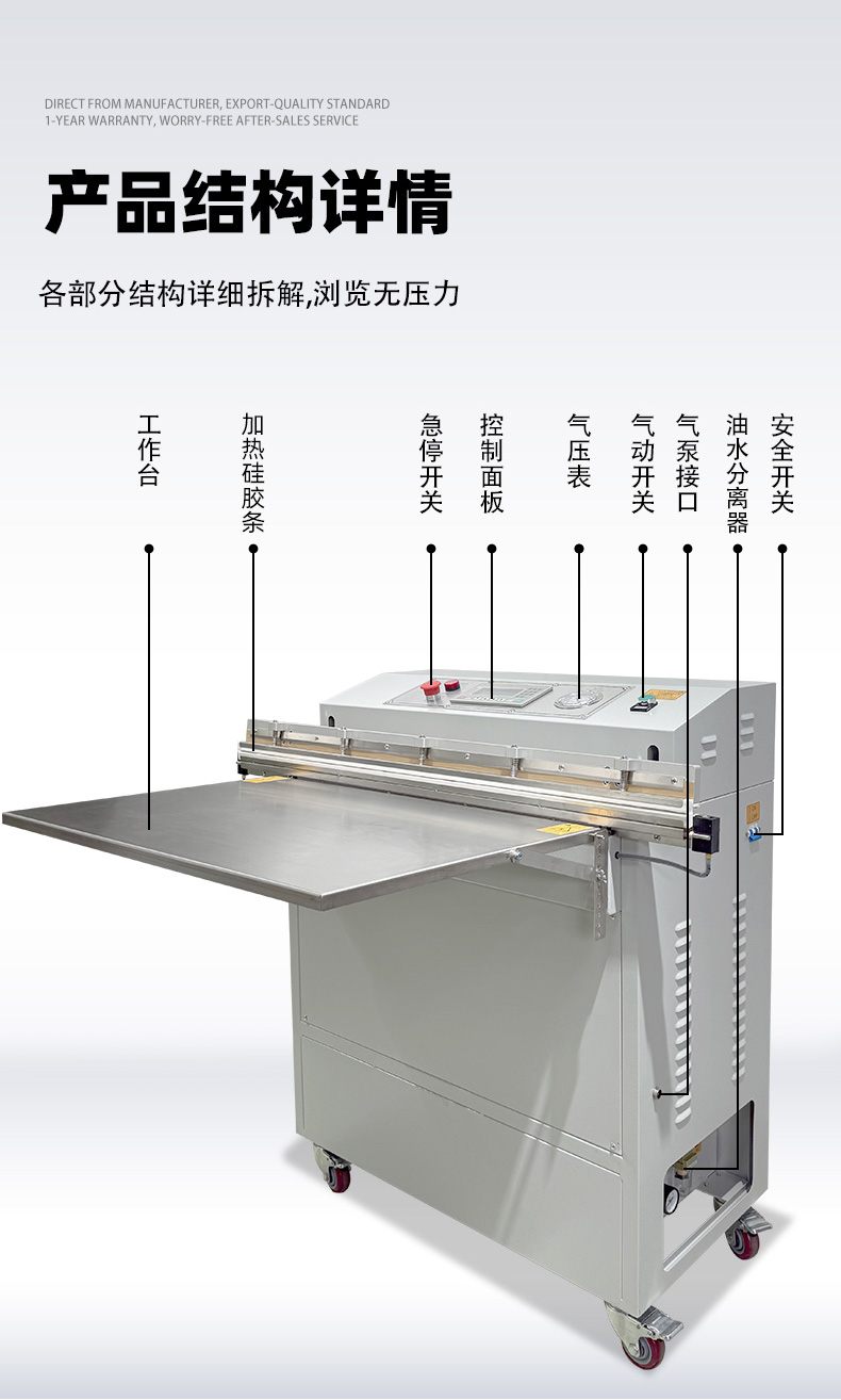 - 外抽真空包装机的热封条通常位于抽气嘴下方或封口机构处,外部有金属防护盖(防止误触高温)。