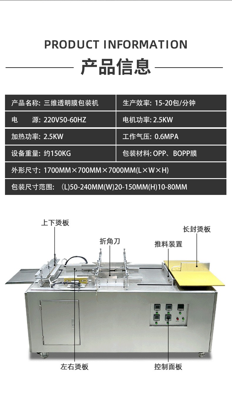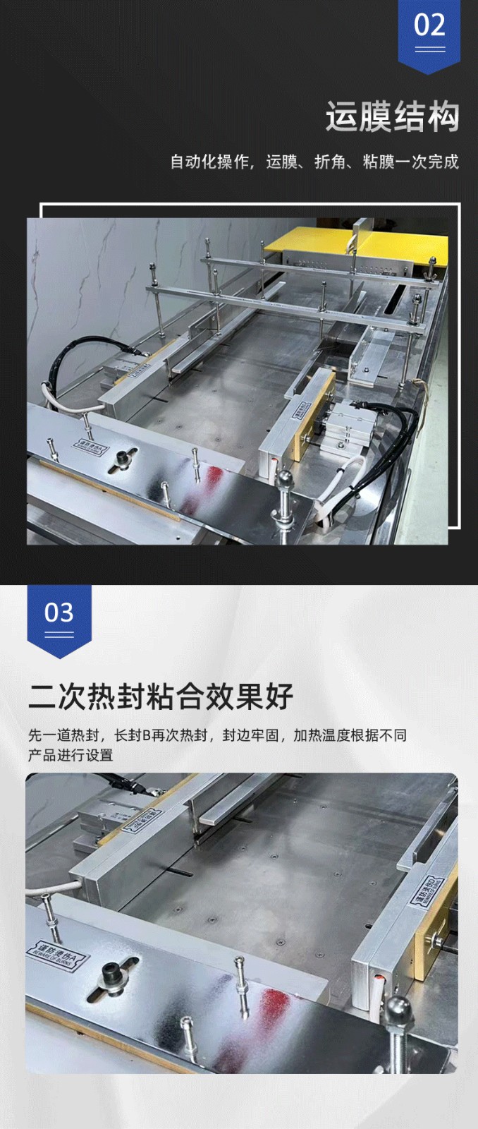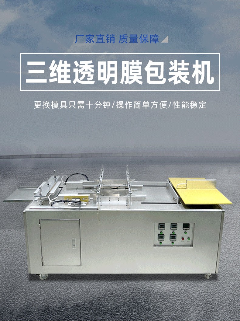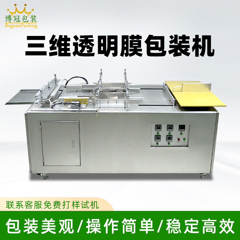 设备通过 “膜料预处理→人工上料定位→三维裹膜成型→热封切边→折边定型→成品输出” 的流程,实现产品的立体包装,具体步骤拆解如下: