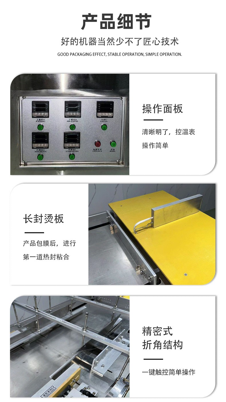 - 折边定型:封切后的产品进入折边工位,预热装置先对产品两端的多余膜料进行软化(便于塑形),再通过机械折边机构(侧折板、端折板)将膜料折叠、压合,使包装边缘平整紧致,最终形成与产品形状完全匹配的立体包装;