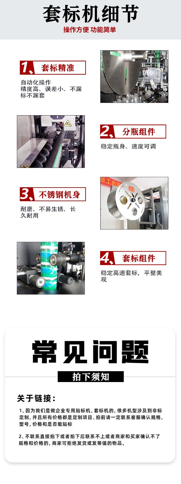 - 应用场景:适配圆形瓶、方形瓶、椭圆形瓶等不同形状容器,尤其解决异形瓶因输送时 “偏移、旋转” 导致的套标歪斜问题。