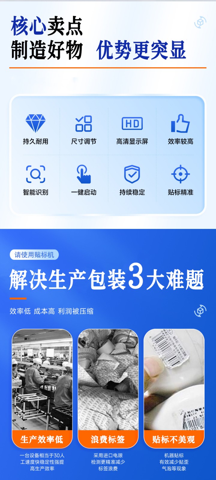 - 技术优势:解决标签印刷误差(如批次间长度微小差异)导致的裁切偏差,确保每片标签长度误差≤±0.3mm,尤其适配印刷图案连续的标签(如环绕瓶身的全景标签)。