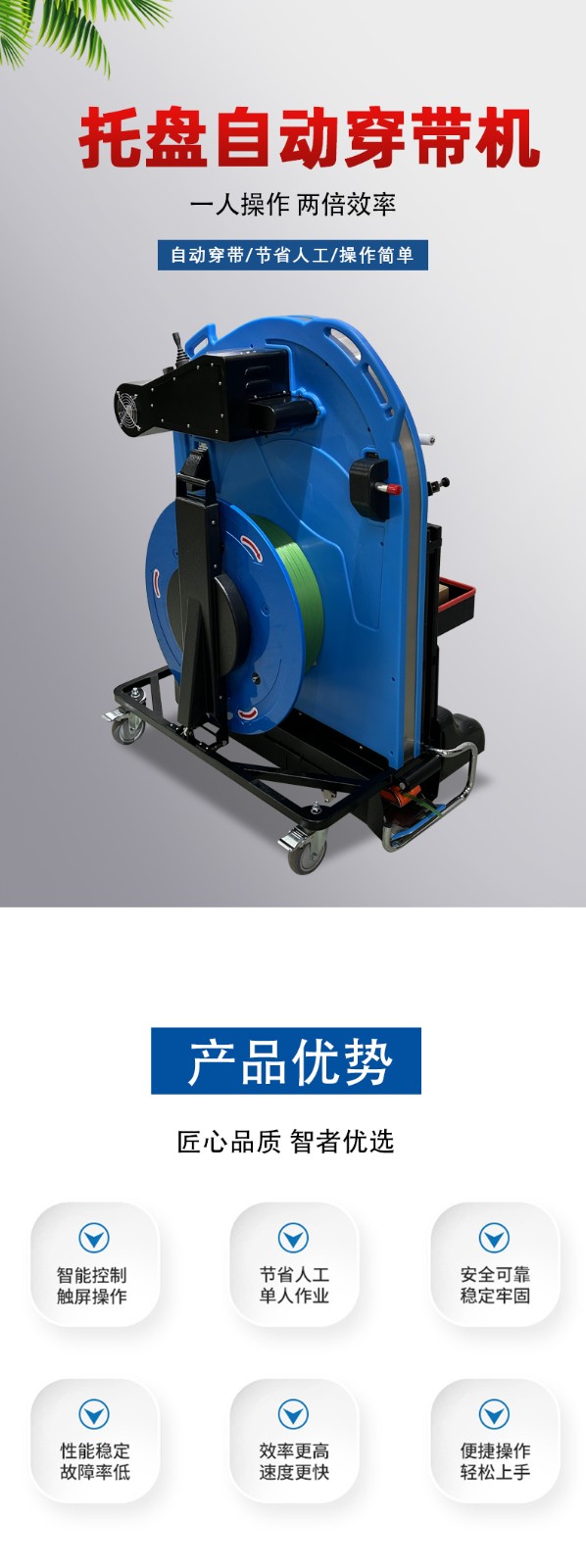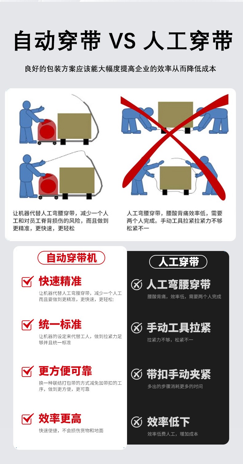 相比人工捆扎(单道耗时 30-60 秒),自动托盘穿带打包机的核心优势体现在三个维度: