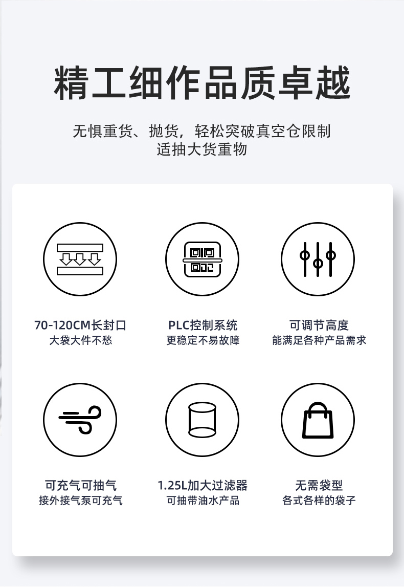 可定制与多模式适配不同尺寸:部分机型支持封口规格定制,封口长度可达到 800mm、1000mm 甚至 1200mm 等,适配不同宽度的包装袋。同时,部分先进机型预设多组工作模式,可快速切换真空、充气、封口等流程,适配从小袋糕点到大袋五金模具等不同尺寸、类型产品的包装需求。