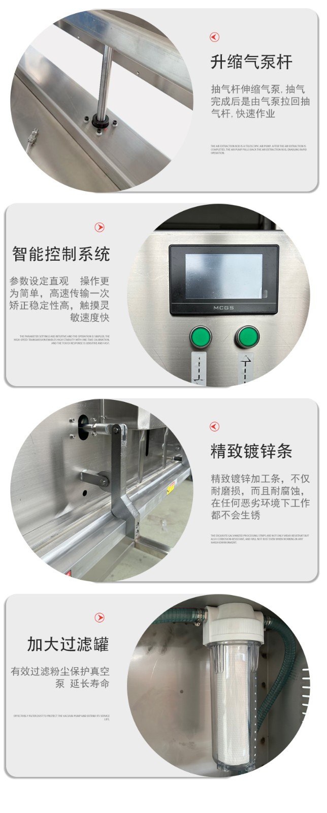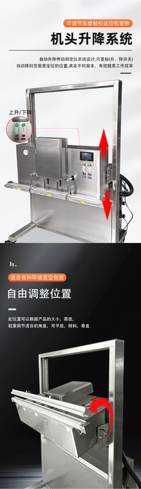 升降结构适配不同高度:工作台或封口部件可灵活升降,例如 BG-1200型号的立式真空包装机,封口离地高度可调节;立式升降系列机型头部可垂直无论是小袋零食,还是 50kg 的大袋大米、塑胶料,都能找到适配的包装高度。