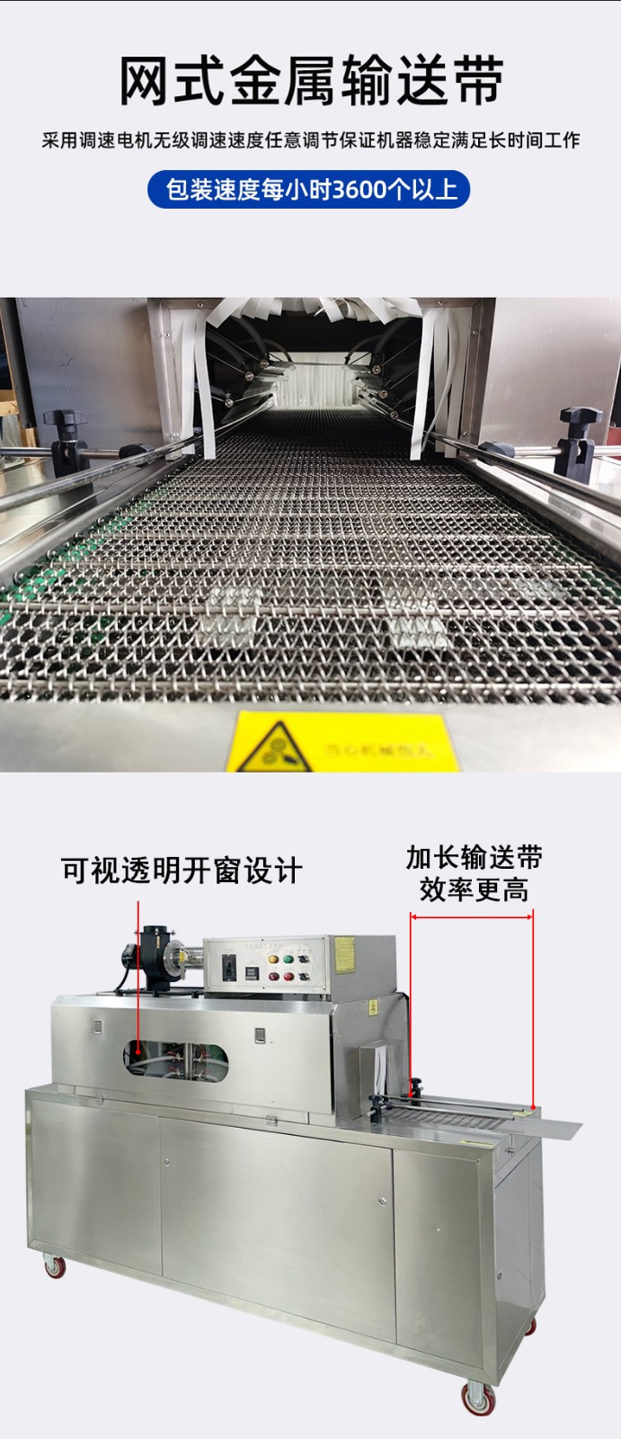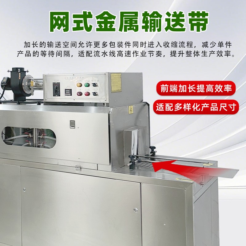 - 输送系统:用于将待包装的产品输送到蒸汽收缩区域,常见的有输送带、输送链条等,材质多为不锈钢或其他耐高温、耐腐蚀材料。