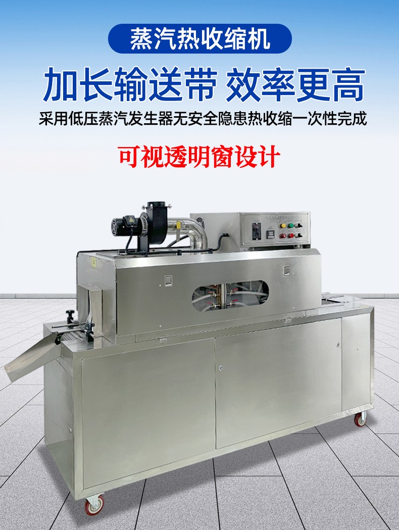 减少设备占用空间,适配多场景布局需求传统蒸汽收缩包装方案中,独立蒸汽发生器体积较大,需与收缩机分开放置,还需预留管道连接的空间,整体占地面积大,对厂房面积较小的中小企业或生产线布局紧凑的场景极不友好。而蒸汽收缩一体机通过结构优化,将蒸汽发生模块内嵌于设备主机框架内,采用垂直分层或侧置内嵌的紧凑设计,整体占地面积相比 “分体式设备组合” 减少 30%-50%。这种集成化设计不仅能轻松适配车间狭窄区域、流水线嵌入式工位,还可灵活移动至临时包装作业区,无论是固定生产线还是临时加工点,都能高效利用有限空间。