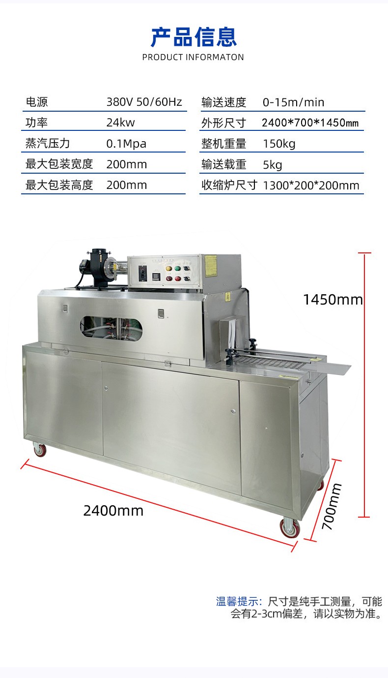 简化操作与管理流程,降低人工学习成本分体式设备需要分别操作蒸汽发生器和收缩机:先启动发生器预热,待蒸汽压力达到设定值后,再开启收缩机输送系统,操作过程中需频繁往返查看两台设备的参数,调整难度大,对操作人员的专业要求较高。蒸汽收缩一体机配备集成式智能控制面板,将蒸汽温度、压力、输送速度、收缩时间等核心参数集中显示与调控。操作人员仅需在面板上输入产品包装要求的参数,设备即可自动完成蒸汽发生、恒温输送、精准收缩的全流程作业,无需单独管控蒸汽发生器。同时,设备内置故障自检系统,可实时监测蒸汽发生模块的运行状态,一旦出现异常(如缺水、压力不稳),会立即发出警报并自动停机,相比分体式设备的 “双机分别巡检”,操作步骤减少 60% 以上,新人仅需简单培训即可上岗,有效降低人工管理成本与操作失误率。