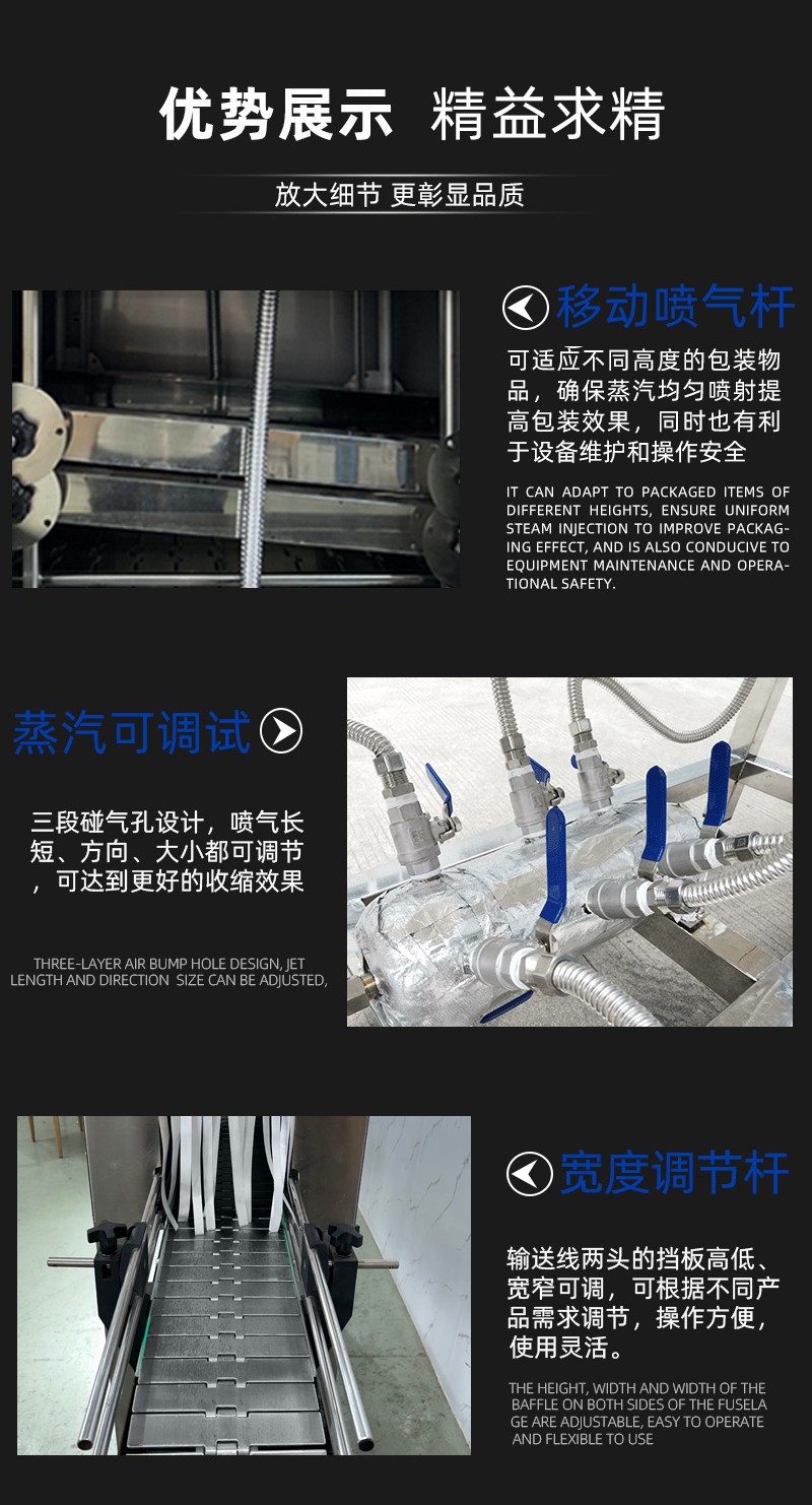 在收缩效果上,热风收缩受限于热风流动的不均匀性,容易出现局部温度过高或过低的情况,导致膜材收缩后表面产生褶皱、气泡,或边角处收缩不紧实,影响包装美观度;而蒸汽具有良好的渗透性和扩散性,能够均匀包裹产品和膜材的每一个部位,使膜材受热同步且均匀,收缩后能紧密贴合产品表面,无论是规则的瓶装,还是不规则的异形件,都能实现平整光滑的包装效果,大幅降低次品率。