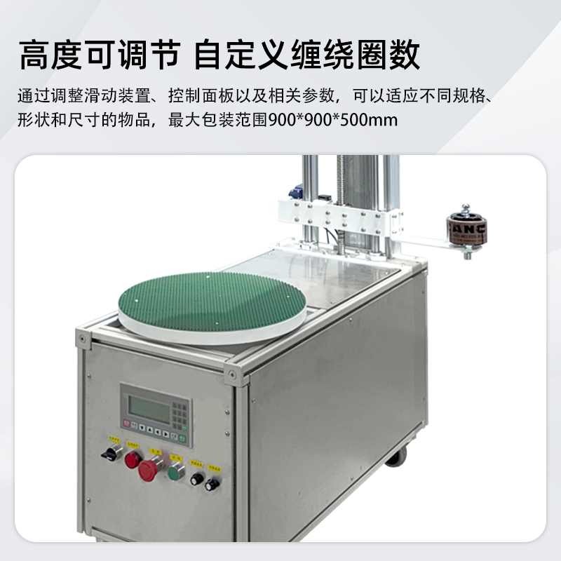 在灵活性层面,它无需提前预设大量复杂参数,操作人员仅需简单培训,就能快速完成不同尺寸、不同形状产品的切换作业。通过人工微调定位与缠绕角度,实现高效适配,完美契合多品种、小批量的生产模式。同时,设备机身设计紧凑,无需配套自动化输送线,即便车间场地狭窄,也能灵活摆放,甚至可搭配脚轮实现移动作业,进一步拓展应用场景。